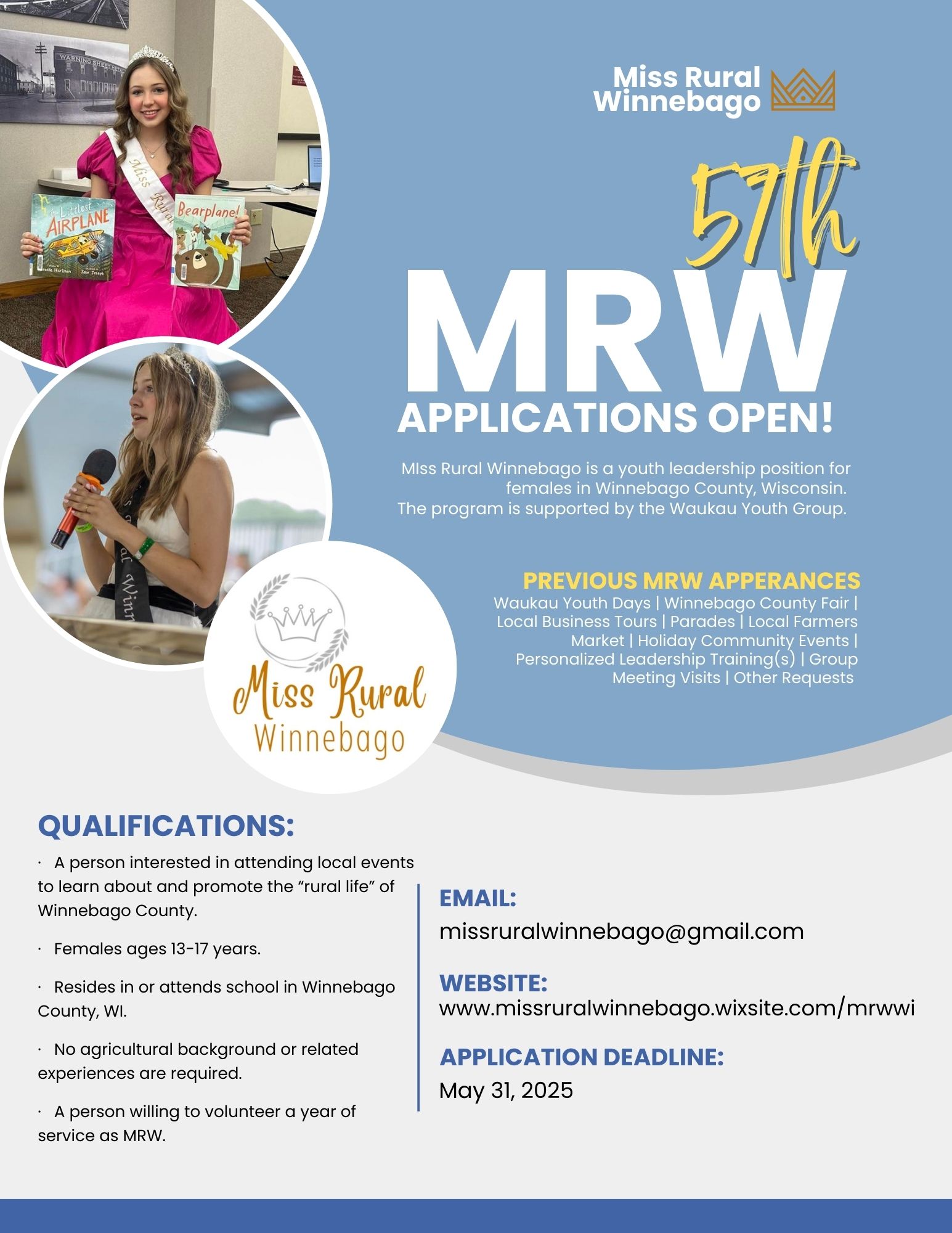See attached flyers for Fairest of the Fair, Ms Rural Winnebago, Endless Adventures and Farmer for a Day